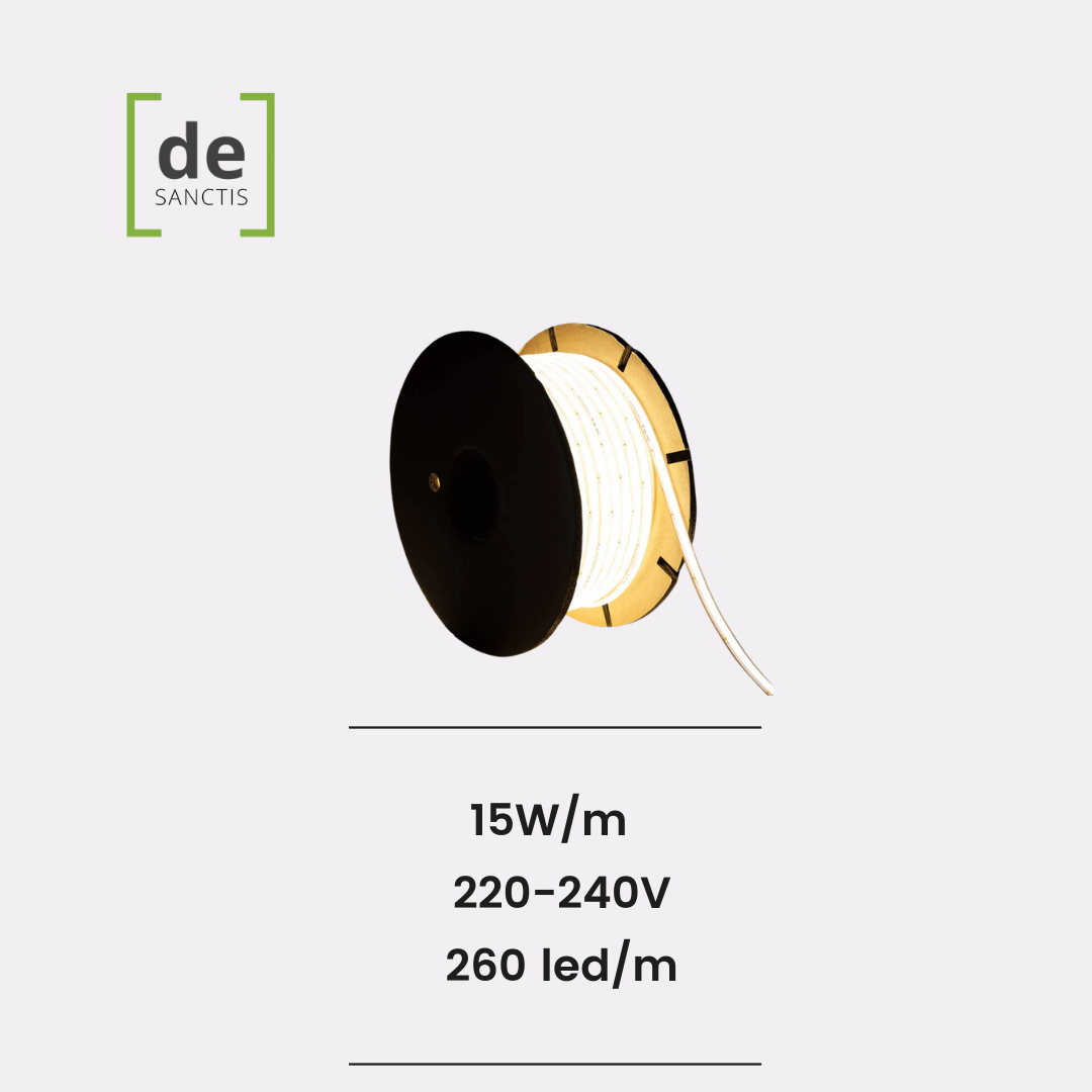 Bobina 50m Striscia LED Regolabile 220V Autorettificata Larga 10mm IP65 Taglio 5cm – De Sanctis Light and Design
