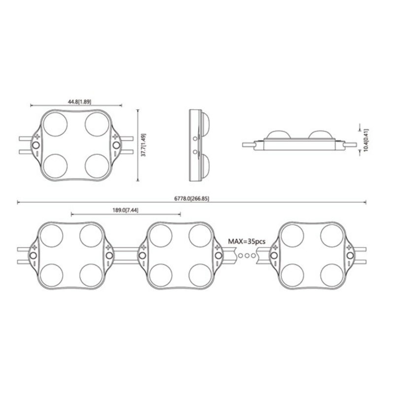 Dimensioni compatte (48×37,7×10,4mm), ideale per retroilluminazioni con profondità da 60mm a 200mm. Resistente ad acqua e polvere grazie alla protezione IP67, con biadesivo 3M per installazione semplice e sicura. Fornito in catene da 35 moduli, collegabili fino a 30 pezzi in cascata.